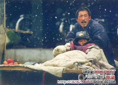 (70)4月塞外的一个早晨天空飘洒着纷纷扬扬的雪花 一个中年男子的菜摊车上坐着一个小男孩 孩子用给菜保温的被子围着 父亲不时用手给儿子掖掖被子