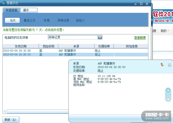 如果学校网关更新了 瑞星检测出来你之前的ARP规则和当前的网关MAC不符必然就会判定你发送的是arp欺骗包啊~