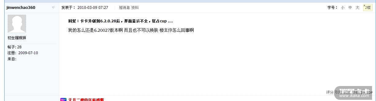 http://zhidao.ikaka.com/Aspx/Html/StaticHtml/316/316894.html卡卡6.2最新版本没有提供换肤功能,这和升级或者升级报错没有关系!