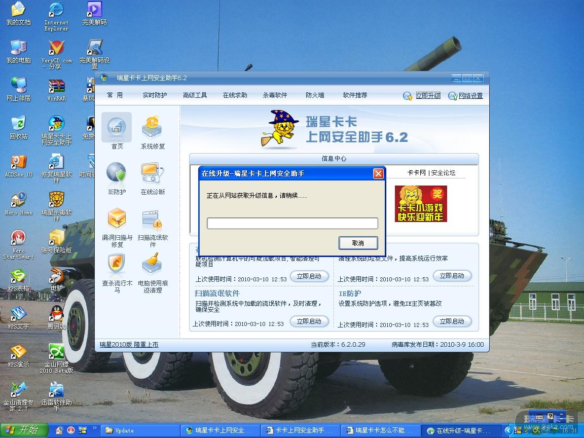 卡卡升级遇到和您相同的问题,看了帅哥阿福的回帖,糊涂起来。这样的问题是由于卡卡自身的问题,还是咱们的计算机有问题?应该谁来解决?我为什么这么问?有原因,最近瑞星升级也遇到了问题,升级日期总也不变,特别是春节后,16日升级,日期是5号的,我发短信咨询,工程师却不正面回答,只告我最新版本代号,弄得我一头雾水。瑞星光顾与360打架,服务是越来越差了。