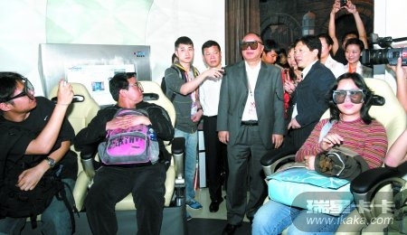 昨日,上海世博园重庆馆,市长黄奇帆戴上特效眼镜和观众一起体验精彩纷呈的“山城美景”4D电影。
