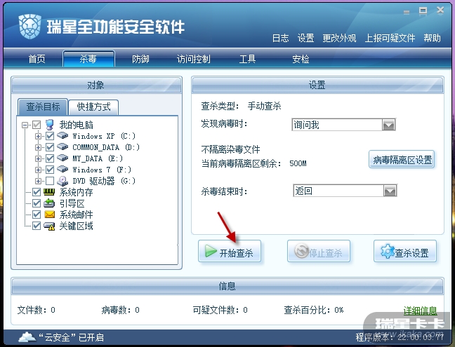 切换到“杀毒”。点击“开始查杀”,就那么愣愣的呆在那里,没任何报警。也没任何提示对话框。