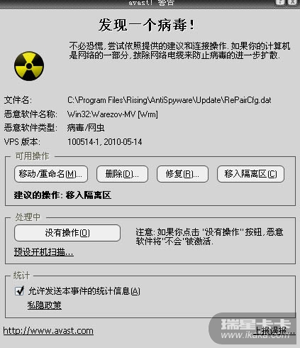 最近几天老是有警告跳出来,说在Rising\AntiSpyware\Update\RePairCfg.dat里找到Win32:Warezov-MV [Wrm]这种病毒,已经好几天了,修复、移入隔离区、删除都不行,不知道应该怎样解决这个问题?我杀毒软件是AVAST,现在的软件版本是4.8专业版4.8.1368,病毒库版本是100517-1