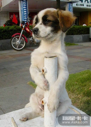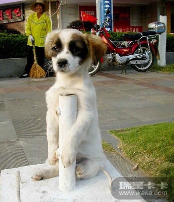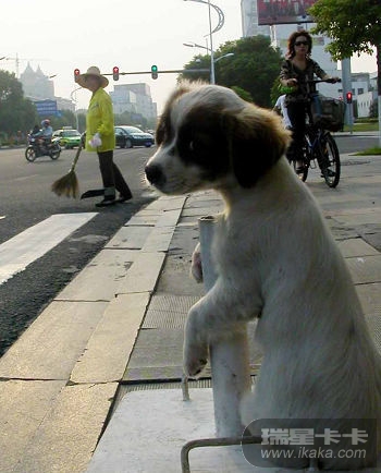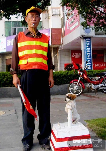 回家时,在路旁看见一只小狗站在红白相间的台子上扶着一根铁杆一动不动,很是奇怪,于是向路旁的交通协管员询问,答案让我忍俊不住:这只小狗叫乐乐,协管员带来的天天在这站岗........!