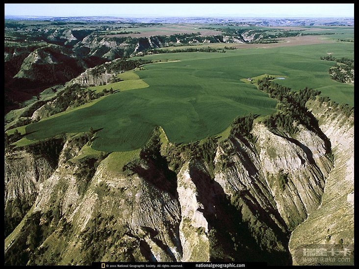“麦田把密苏里裂谷铺满了绿色,东蒙大拿大平原寂寞的一角遇到了一个突然的结束。密苏里河及其支流在砂岩地表下切出一道道沟壑,割裂开原野。杂乱的空间支配着裂痕,对那些坚持开辟自己道路的民族这是理想的(Rough and remote spaces rule the Breaks, perfect for folks who insist on carving their own way望强人来改这句)。