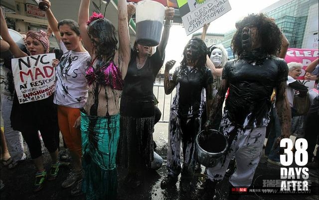 5月 28日在纽约曼哈顿的BP油站门前,一群抗议者一边尖叫一边用“原油”泼向自己,抗议漏油事件对野生动物造成的灭顶之灾。