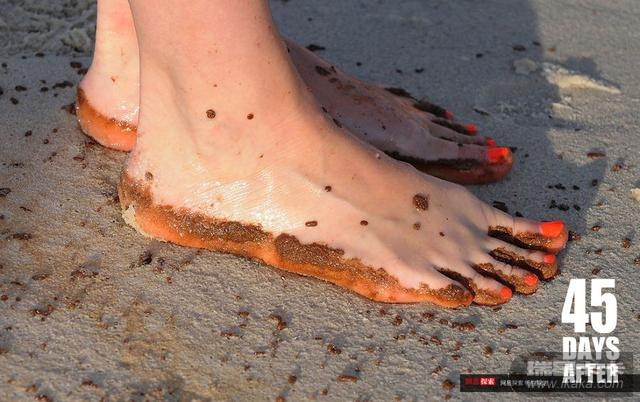 美国田纳西州一名少女在海滩散步后,发现脚上已经沾满了来自墨西哥湾的油污。