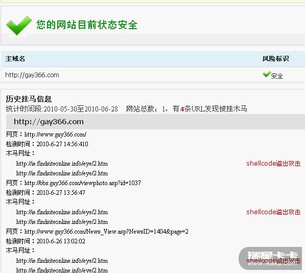 这是这几天来瑞星的报告,我真的查出不来了,也不像以前网站被挂马后网页的代码里会有其他的恶意代码,这次太吓人了,一点都没有发现,有的网友提醒我说,打开我的网站会自动跳转到其他的网站,但在我的电脑上打开就没有转向,不知道这又是怎么回事?像下面图片上显示的恶意代网址,在网站里根本就查不到,有哪位高人能够帮帮我,急死我了!!!!!!!!