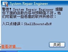 入口点错误:ShellExecuteExW (危险等级: 一般, 被下面模块所HOOK: C:\Program Files\Maxthon2\Modules\MxKWS\kswebshield.dll)