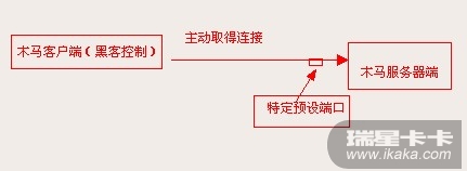 这种连接方式的木马以冰河为代表。冰河是一款功能强大的远程控制木马,基于TCP/IP,可以基本黑客都认识。这种木马的连接技术就是主动连接,即服务端在运行后监听指定端口,而在连接时,客户端会主动发送连接命令给服务端进行连接。这种方法有个很大的弊处,那就是在连接的时可以轻易的被防火墙所拦截。如图。