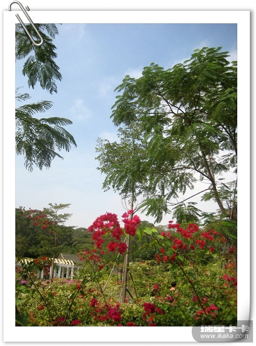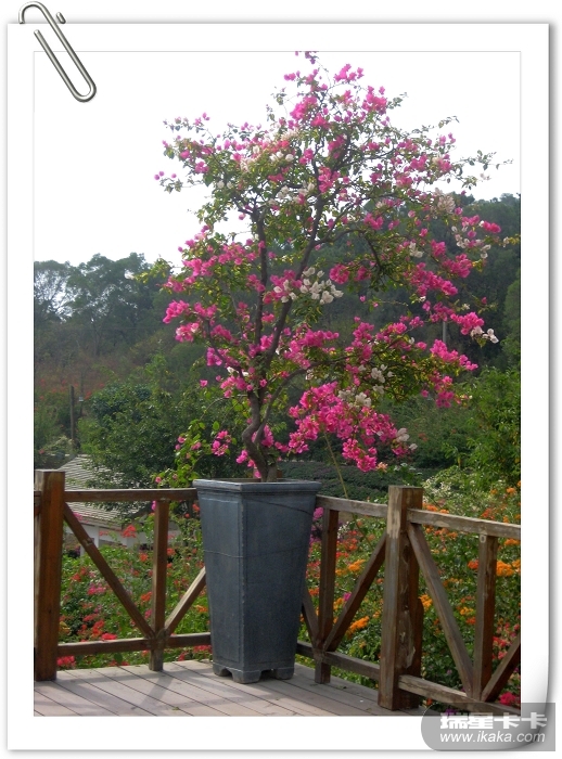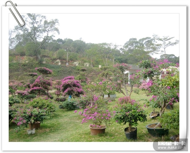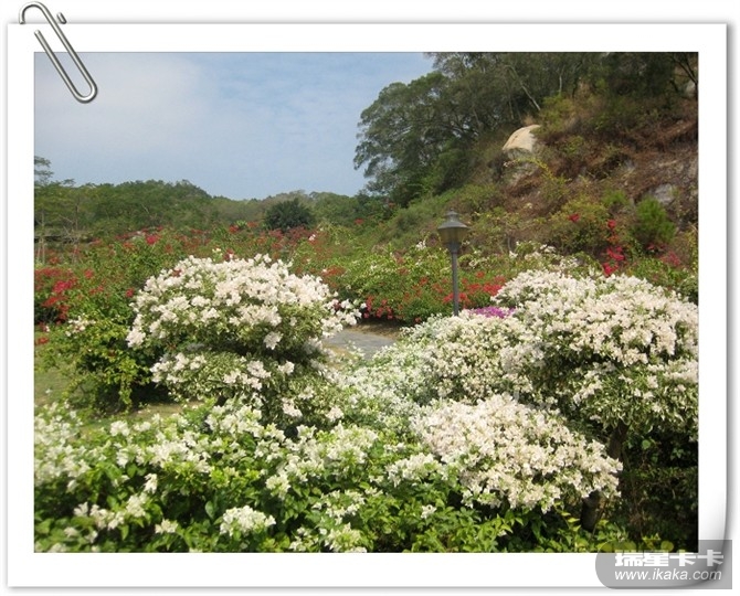 沿着上李水库旁的山路往前走,不一会儿就到了门口。从木质栈道与石头栈道拾级而上,两边是各样各式的三角梅,一期面积3.9万平方米,共栽种三角梅1万多株,50多个品种。在这里,有许多品种都是平日难得一见的,如皱叶深红三角梅、白色三角梅、重瓣三角梅、砖红三角梅、光叶斑叶三角梅、金叶紫花三角梅等等。