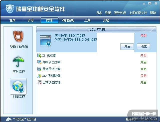 瑞星托盘图标(小伞)--右击--详细设置--网络监控--在对应项前面打上勾--确定--就可以了。