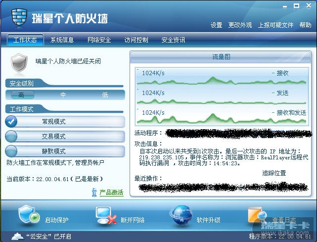 后,防火墙就提示了,而且有十多分钟不能访问卡卡安全论坛的所有网页,只有停止防火墙保护才能访问。