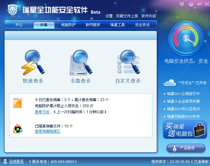 因为瑞星RIS2011版较瑞星2010版甚至更早的版本有很多不同,习惯老版瑞星操作的用户可能一开始很不适应,所以本贴将尽可能将全部的瑞星2011版的页面拆分出来一一进行介绍!借以希望帮助您更好测试瑞星2011版界面