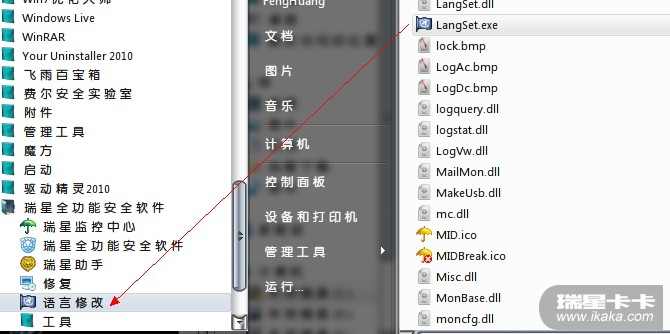 在界面里2011版已经没有更改语言的选项了,但是我提供一个方法依旧可以修改2011版语言。那就是运行安装目录下 的LangSet.exe,把它新建一个快捷方式命名为“语言更改”把这个快捷方式拖拽到瑞星开始菜单就可以方便的修改语言了。
