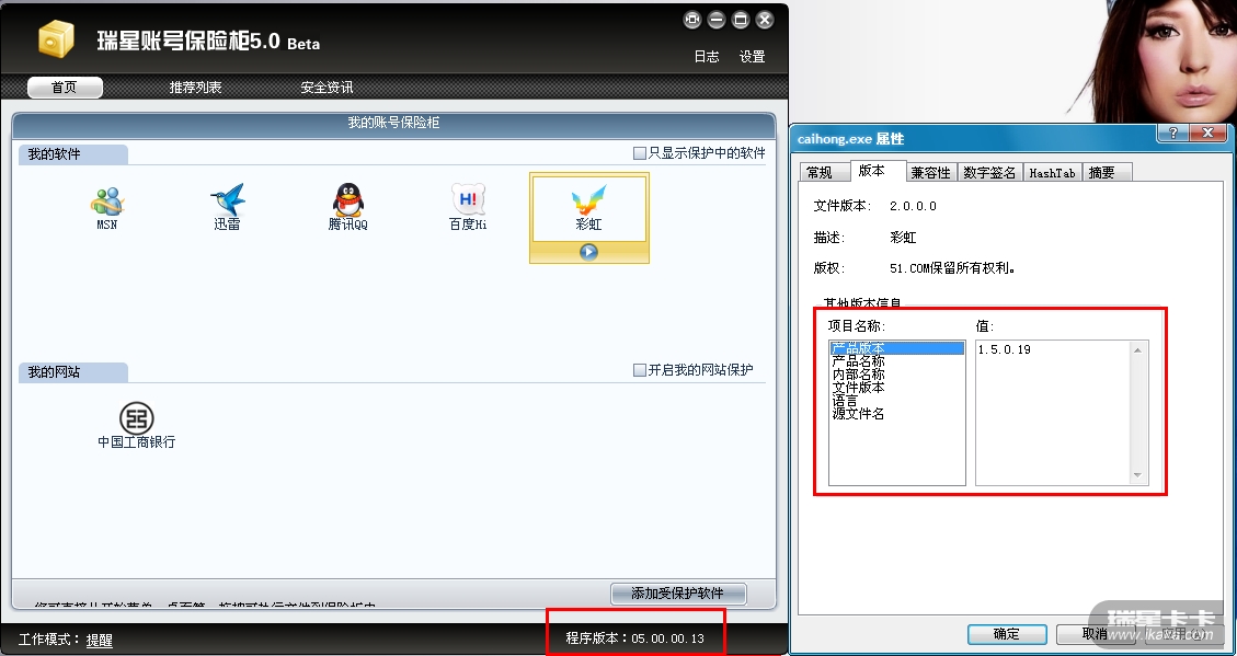 相关软件:51彩虹版本1.5.0.19 瑞星保险柜版本05.00.00.13