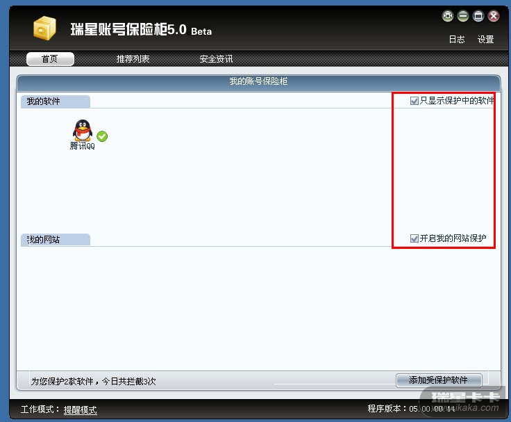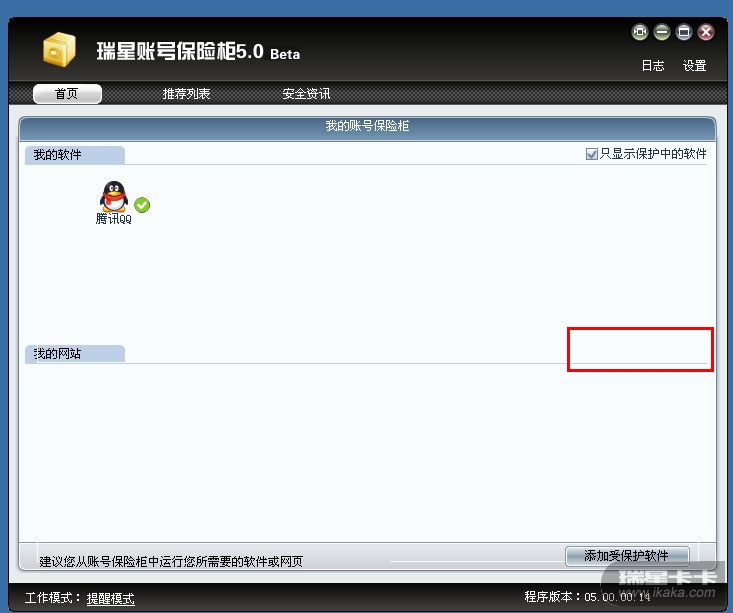 问题描述:打开主界面,中间的“我的网站”“开启我的网站保护”显示有问题,只要一点击上边的“只显示保护中的软件”后下边的“开启我的网站保护”就会消失,如图