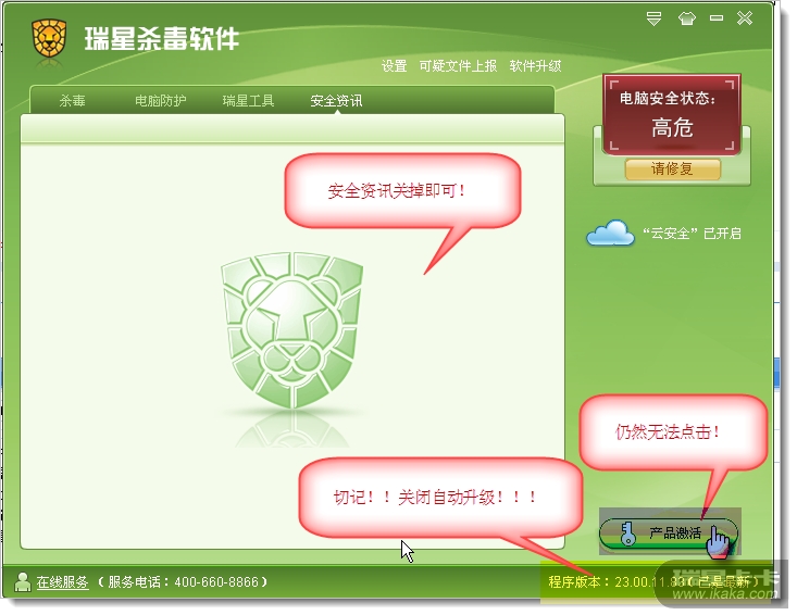 你如果想看到主界面,我可以给你传附件,你替换一下即可。但请注意:近期不要再升级,等候瑞星提供解决方案。