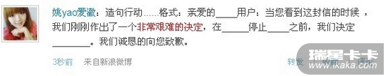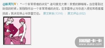 韩寒---我刚刚作出了一个非常艰难的决定。在小四娘停止对别人进行卖萌撒娇和沾花惹草之前,我决定将在有小四娘出现的地方自觉尿遁。韩寒有幸能陪伴着您成长;未来日子,我期待与您继续同行!