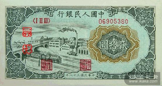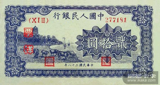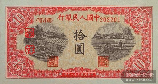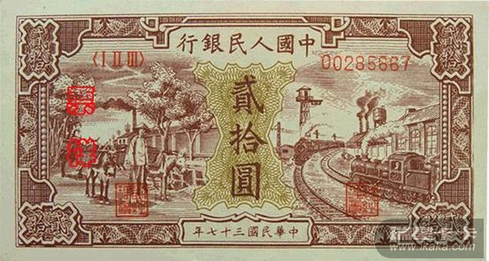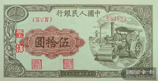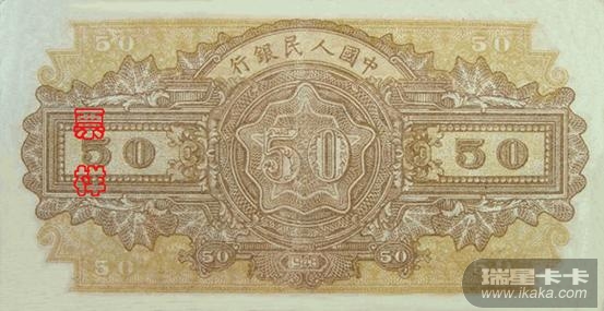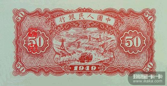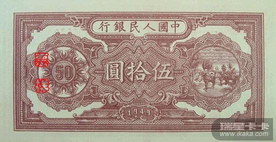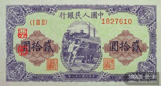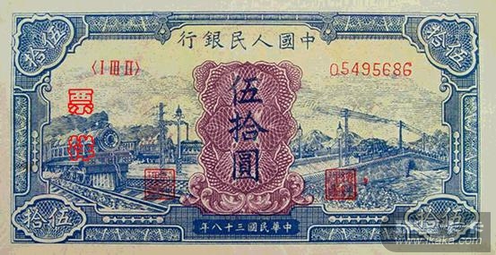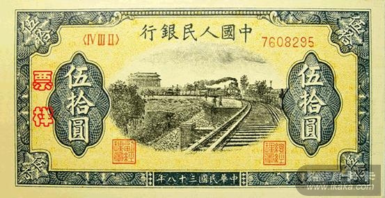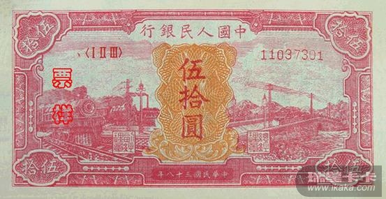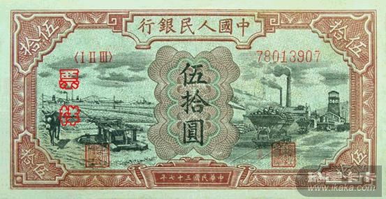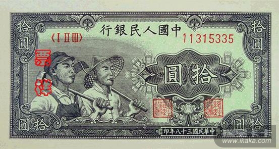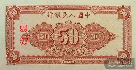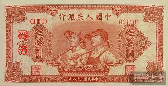 第一套人民币自1948年12月1日开始发行,共12种面额62种版别,其中1元券2种、5元券4种、10元券4种、20元券7种、50元券7种、100元券10种、200元券5种、500元券6种、1000元券6种、5000元券5种、10000券4种、50000元券2种(1949年发行的正面万寿山图景100元券和正面列车图景50元券各有两种版别)。