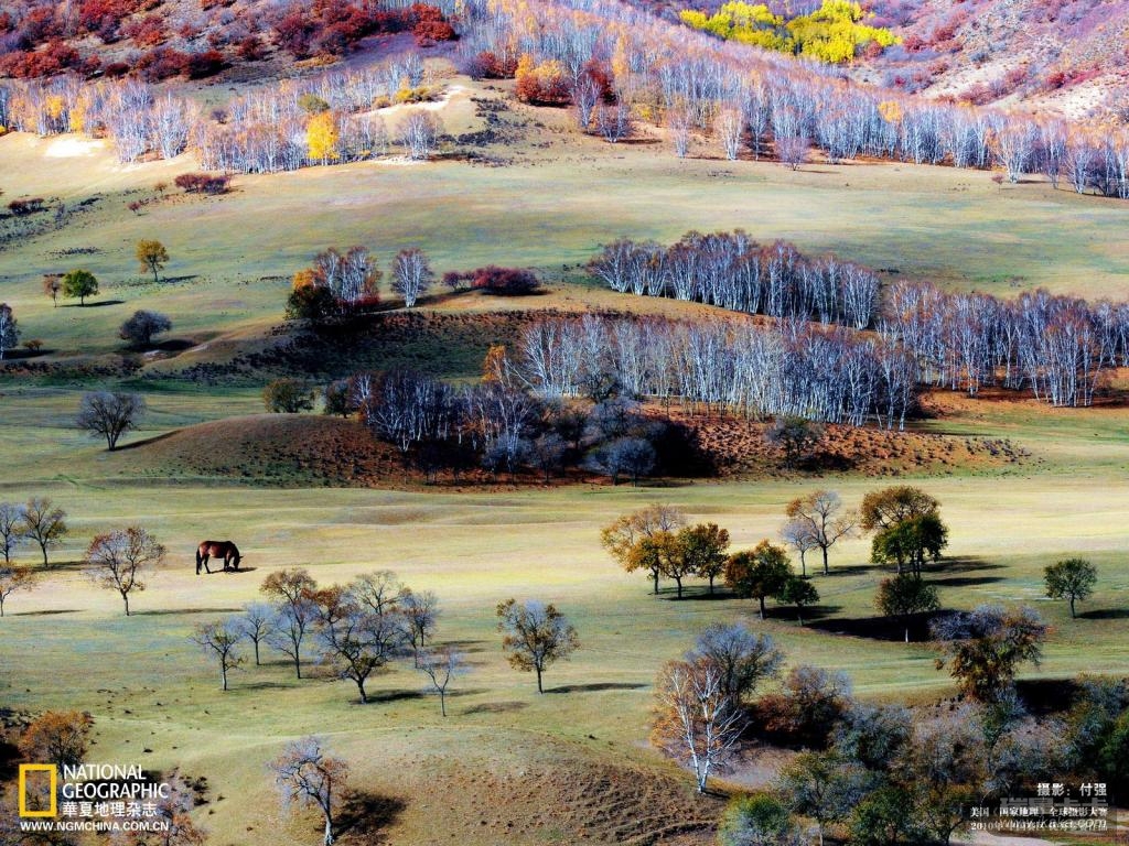 说明:万木丛中缀艳黄,婆娑树影抒柔肠。桦林素裹迎新客,清雅秋园孤马徉。