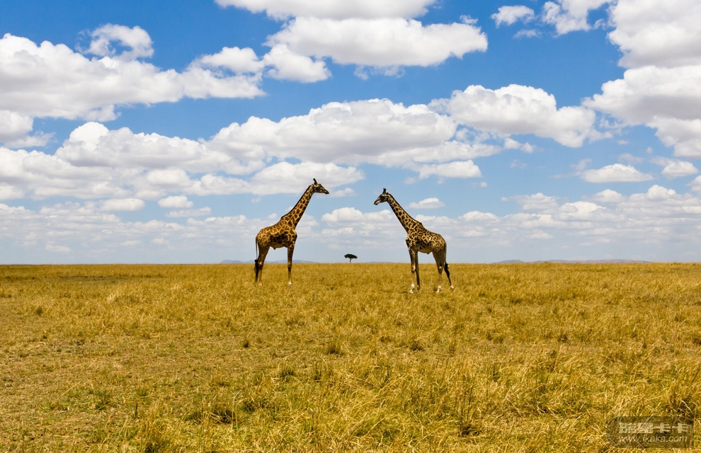 45 非洲大草原上的长颈鹿。这是以非同寻常的视角在肯尼亚马赛马拉国家公园拍摄的两只长颈鹿和一棵大树。
