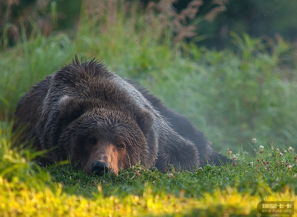 7 阿拉斯加州科迪亚克岛布什金河畔的棕熊。这头熊上午在河中捕鱼,然后爬上河岸躺倒在草地上。拍摄这张照片时太阳已经升起一个多小时,树上的水珠开始蒸发。当时的气温接近xxx,水汽正从棕熊的体表冒出。从外表来看,它一点儿都不在乎河里的垂钓者和岸上的摄影师。