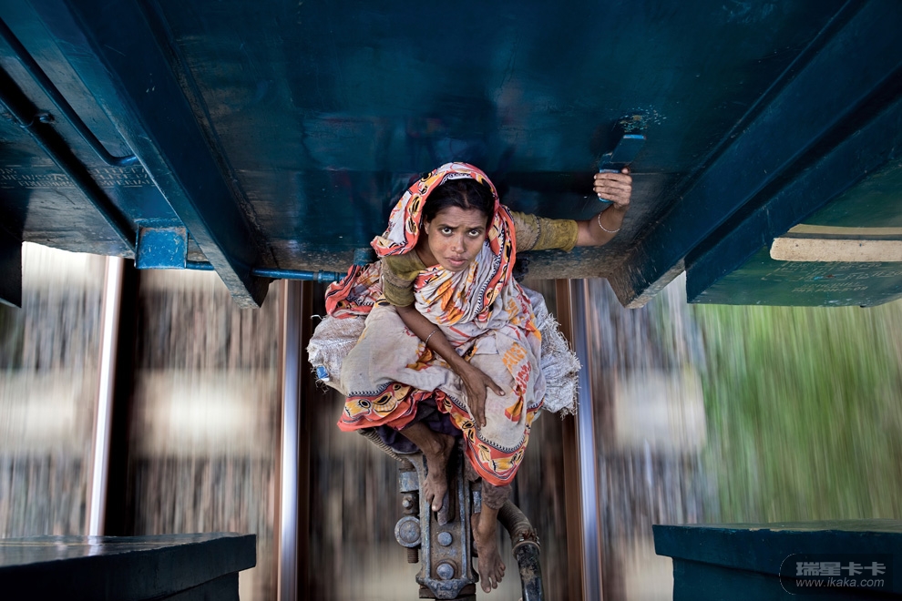 15 充满危险的旅途。一名妇女扒坐在从孟加拉首都达卡开往北方列车的连接部位上,她的行李藏在车厢底下。这是穆斯林的斋月,人们要举行为期三天的庆祝活动。为了过节,成千上万的人离开城市赶往自己的家乡与家人团聚。那些买不到票或无钱买票的人就会爬上车顶或像这名妇女那样在车厢连接部位寻找一个安静的地方。