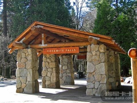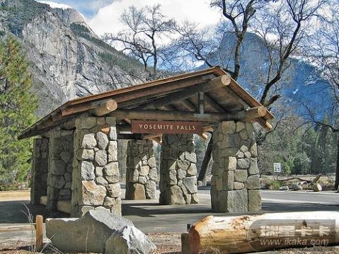 约塞米蒂瀑布公交车站,位于美国加州,简单的条石和横木结构,架起了都市人躲避喧嚣的世外桃源。