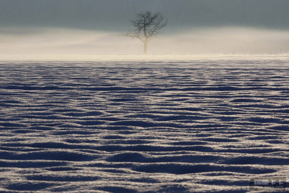瑞士伯尔尼,雪地上弥漫着一层雾,远处是一棵孤树。