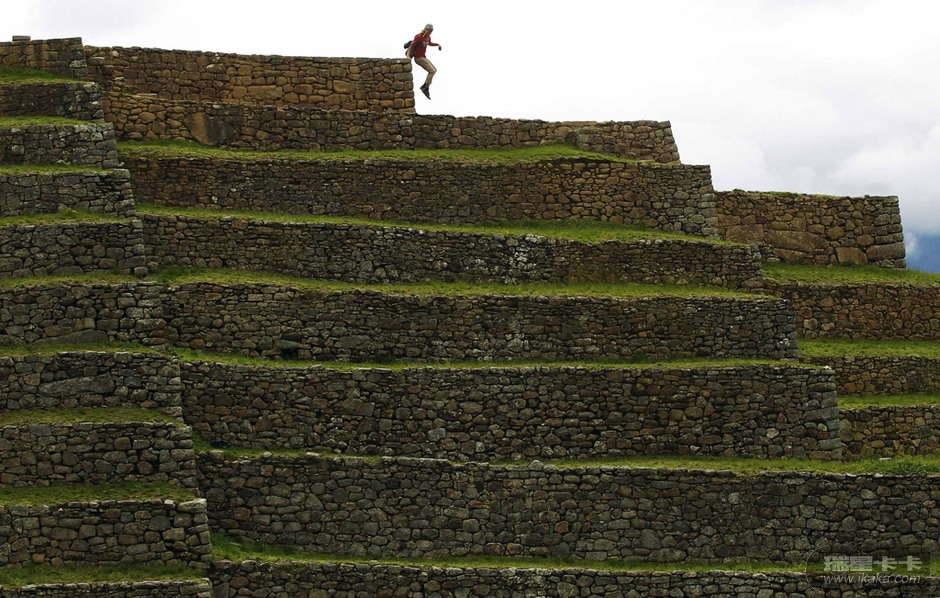 秘鲁库斯科,一名游客正在印加失落遗迹马丘比丘山的平台上跳跃。马丘比丘是南美洲最重要的考古发掘中心,也因此是秘鲁最受欢迎的旅游景点。由于独特的位置、地理特点和发现时间较晚,马丘比丘成了印加帝国最为人所熟悉的标志。