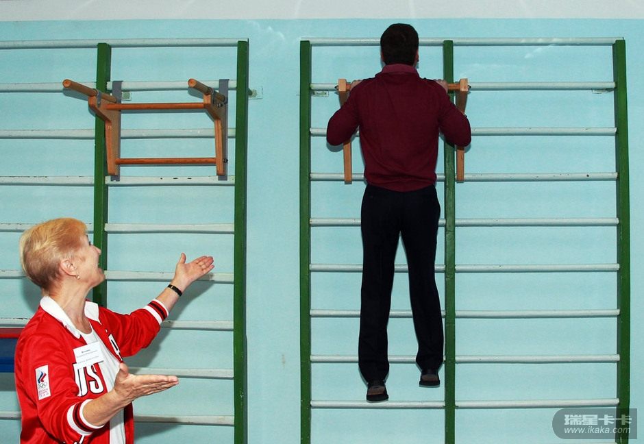 俄罗斯克拉斯诺达地区,梅德韦杰夫在参观村庄学校新建健身房的时候做引体向上。