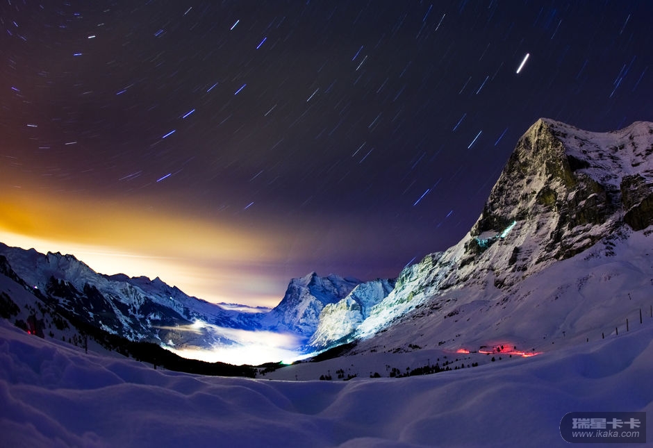 当地时间1月13日,瑞士文根,艾格尔峰北面远眺夜晚的格林德瓦度假酒店。
