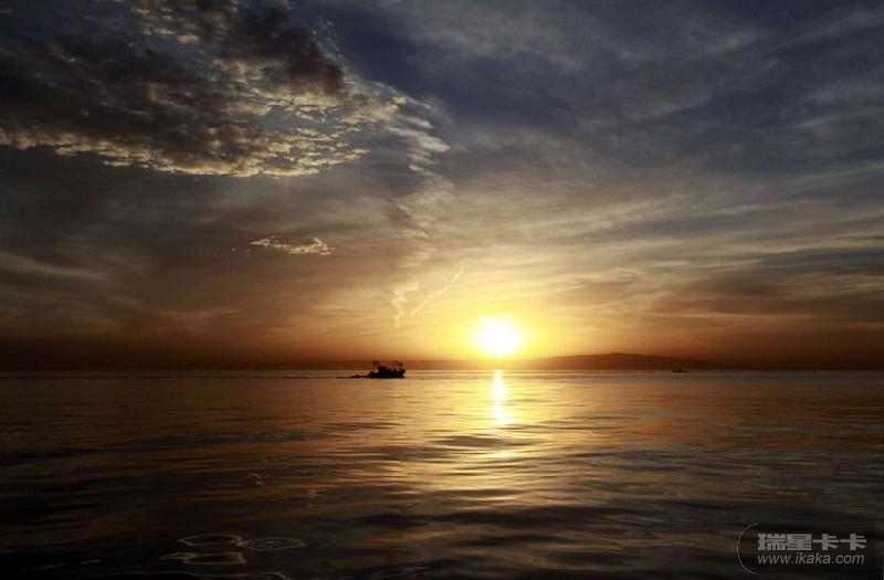 3月4日,阿尔及利亚首都阿尔及尔湾,夕阳下的一艘渔船。