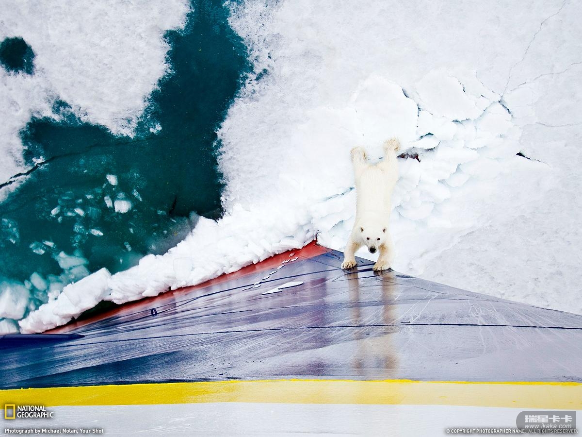 挪威斯瓦尔巴特群岛,一只好奇的雌性北极熊爬在林德布拉德探险公司(Lindblad Expeditions)的科考船“国家地理探险者”号上。