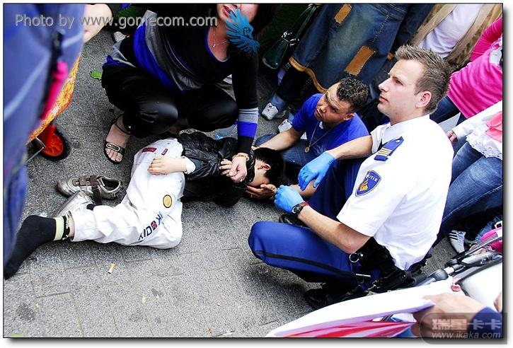 那个托着孩子头部的穿蓝色T恤的荷兰人让我觉得特别感动,从发现孩子倒下开始,就跪在孩子头部旁边托着孩子的小脸儿,在现场救治过程中,也始终一动不动地跪在地上,用自己的双手充当这个陌生的异国孩子的枕头,并告知医生孩子倒地时的情况。