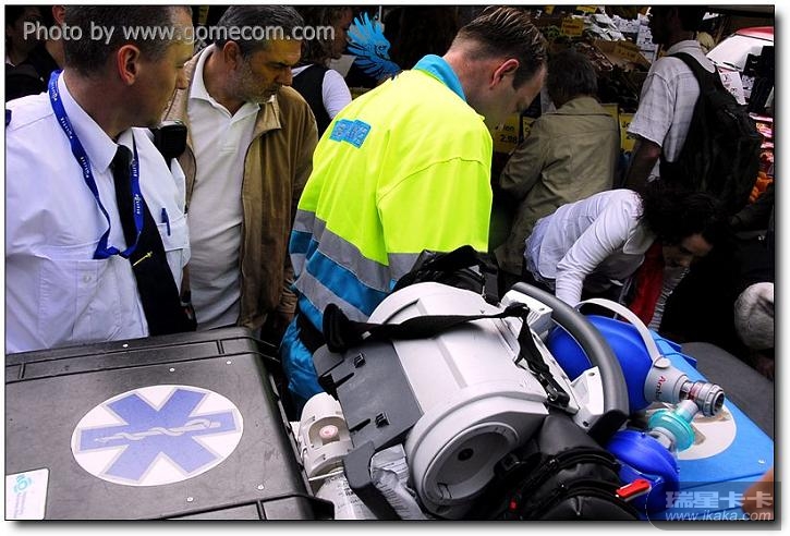 三四个警察和三个急救医生拖着移动担架和器材快速穿过人群冲到现场。