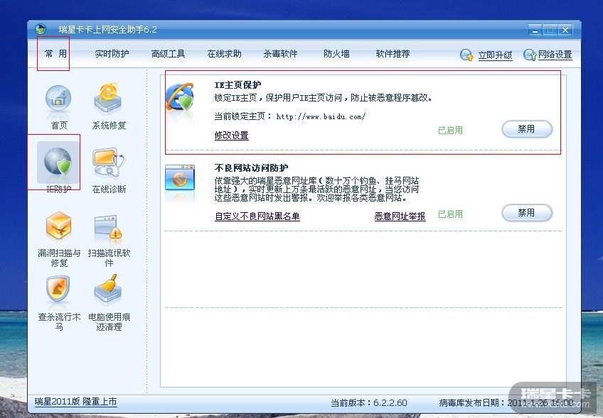 www.ninhao123.com加入黑名单,在IE主页保护的设置里就可以添加恶意网站地址。