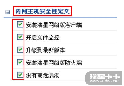 既然是由“对不安全主机的控制策略”引起的,楼主不妨查看一下“内网主机安全性定义”是怎么设置的。如图中所示,只要满足其中一条定义即认为该电脑是安全的。(不知道楼主的防毒墙的具体版本,下图可能与楼主实际的略有不同)
