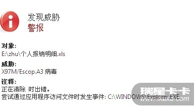 请帮帮忙看下,我公司的所有excel档打开时都提示x97m/escop.a3有这个病毒名,我到瑞星病毒库里也没找到,到网上搜,贴子很少,所以就想到这来求救了...
