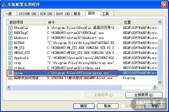 在系统盘的确有PPSAP.exe文件的存在,而且瑞星流量监控也能监测到该程序,只是瑞星的启动项列表中找不到