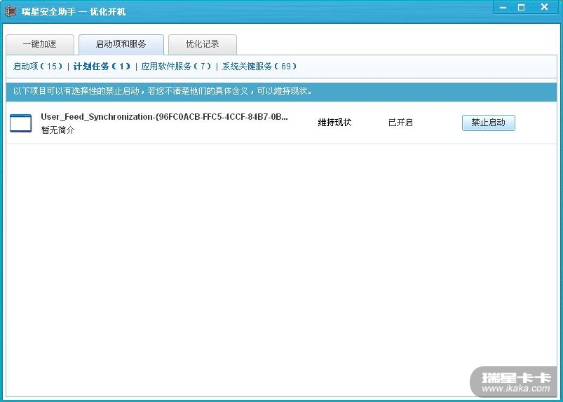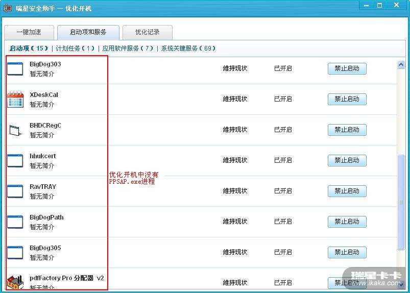 无论是“优化开机”的“启动项”、“计划任务”还是“应用软件服务”(以上三项有截图),还是已优化的项目(有截图),甚至是“系统关键服务”(未截图)都没找到PPSAP.exe。(注:在系统盘符下的确有PPSAP.exe文件的存在,而且瑞星流量监控也能监测到该程序,只是瑞星的启动项列表中找不到)
