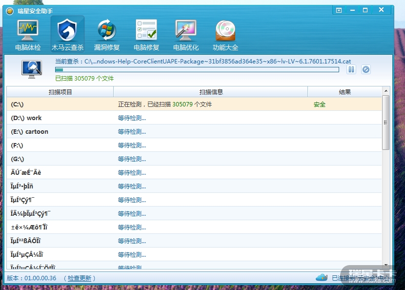 英文Win7 enterprise SP1版本,使用“清理插件”、“木马云查杀”等