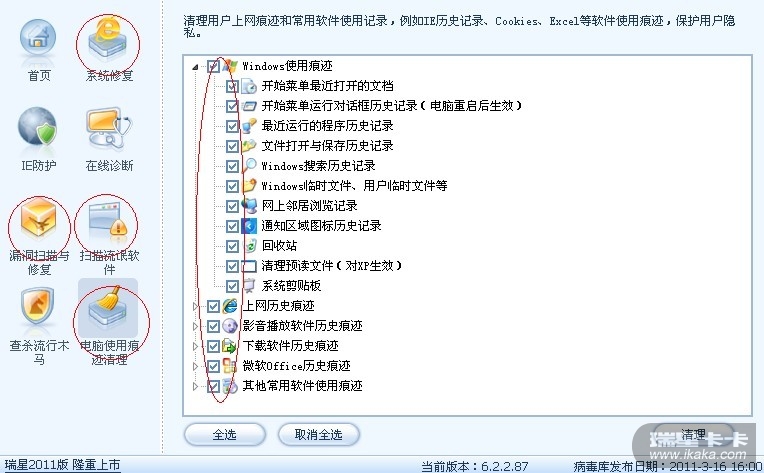 卡卡操作和版本号:(红圈过的是我用过的功能,我估计是痕迹清理里面的问题,所以给细图)