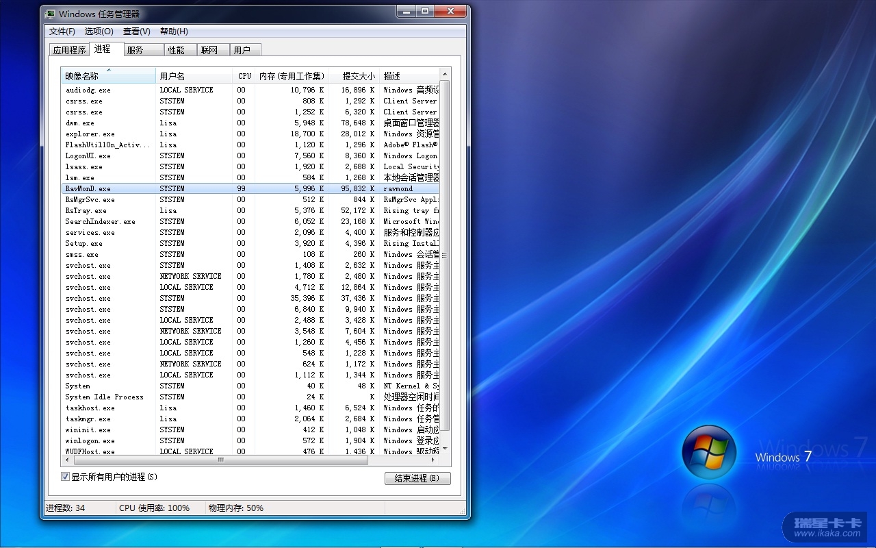 开始并没有发觉,当我开任何程序都感觉一顿一顿的时候,连桌面刷新都反映迟钝了。遂打开任务管理器发现CPU100,进而发现ravmond大量占用了CPU资源。。。