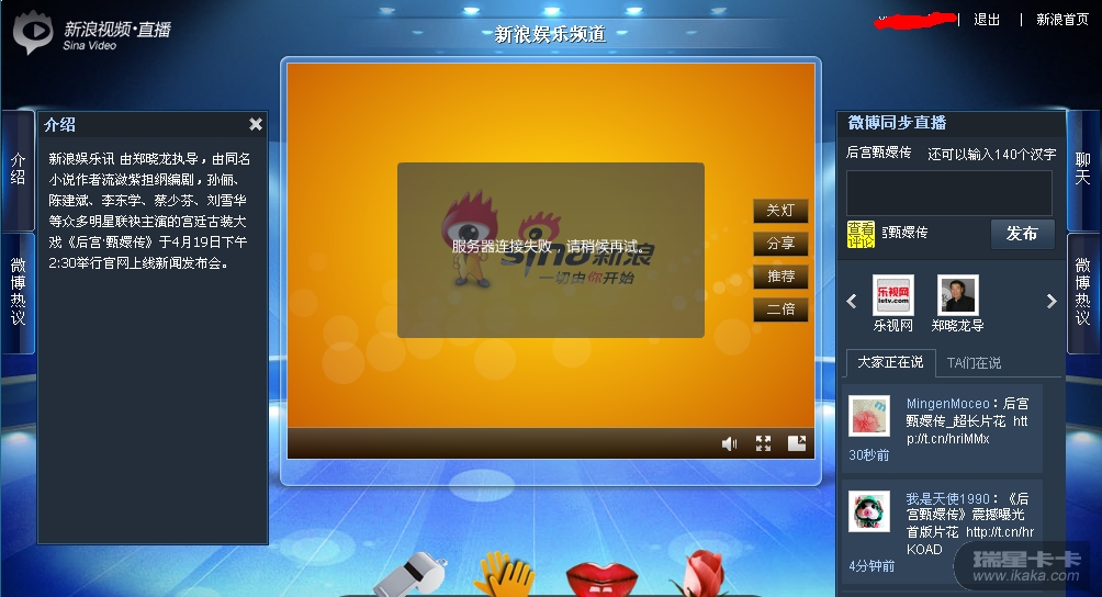 WIN7下测试楼主的链接无论是否开启瑞星监控都提示“服务器连接失败”,但其他新浪视频可以正常观看。