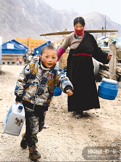 4月10日,玉树藏族自治州结古镇下西同村,5岁的索南然丁(前)帮助母亲提水