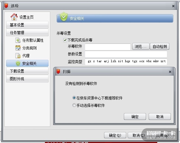 可以手动关联的,在快车添加杀毒软件的位置,指定路径给瑞星安装目录下的ravlite.exe。