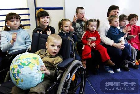 2007年4月20日,在白俄罗斯小城维斯诺瓦的一家残障儿童孤儿院,来自爱尔兰的志愿者和因切尔诺贝利核事故受害的残障儿童交流。