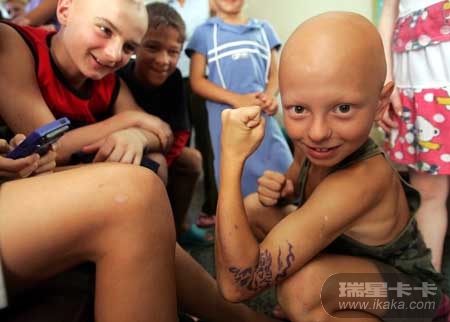 2005年4月5日,切尔诺贝利核事故受害者、患有脱发症的乌克兰男孩巴格丹在古巴首都哈瓦那郊外的儿童医院和朋友们玩耍